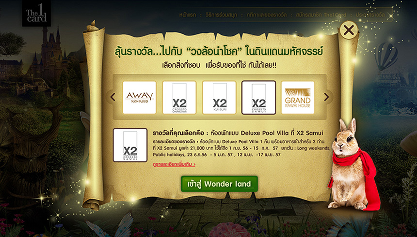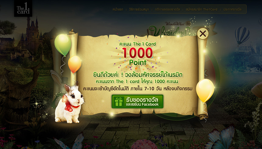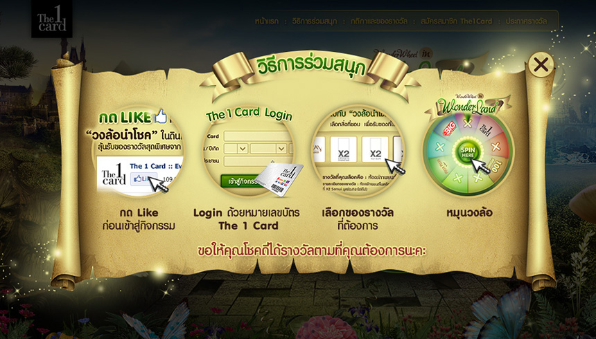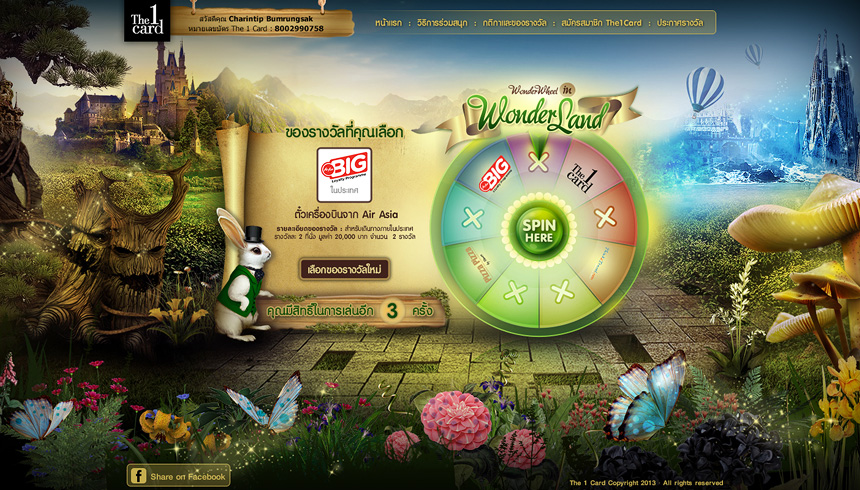 กิจกรรมบน Facebook Application เพื่อเพิ่มยอดสมาชิกแฟนเพจของ The1Card ขณะเดียวกันก็ช่วยกระตุ้นให้ภาพลักษณ์ด้าน CRM ของ The1Card มีความชัดเจนมากยิ่งขึ้น ด้วยเงื่อนไขการเล่นเกมส์ที่กำหนดให้ผู้ที่ต้องการเล่นเกมสมัครสมาชิกของบัตร The1Card ก่อน เพื่อร่วมเล่นกิจกรรมวงล้อ Wonder Wheel ชิงรางวัลจากเซ็นทรัล และถ้าหากว่าต้องการสิทธิ์ในการเล่นเกมมากขึ้น ก็เพียงแค่แชร์กิจกรรมที่หน้า Wall ของเฟซบุ๊ค