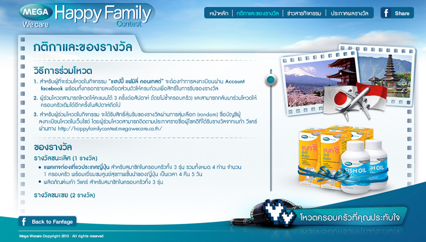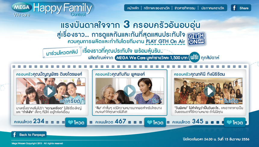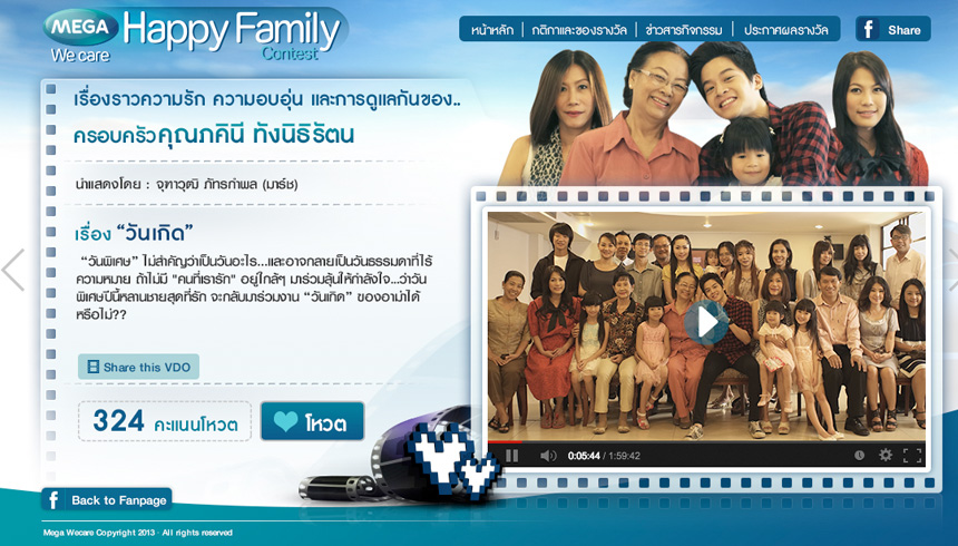 จากโจทย์ที่ต้องการให้ Mega We Care เป็นที่รับรู้ว่าเป็นผลิตภัณฑ์เพื่อสุขภาพของทุกคนในครอบครัว จนเป็นที่มาของกิจกรรม Happy Family แคมเปญที่รวบรวมเรื่องราวของผู้บริโภคว่ามีส่วนในการดูแลรักษาสุขภาพของคนในครอบครัวอย่างไร และเลือกเรื่องราวที่ประทับใจมาสร้างเป็นหนังสั้นโดยผู้กำกับชื่อดังจาก GTH และนำไปเผยแพร่ต่อ