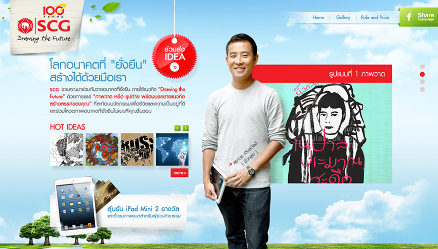 เพื่อสร้างคุณค่าให้กับแบรนด์ SCG ว่าเป็นองค์กรที่เน้นเรื่องนวัตกรรม ควบคู่ไปกับการพัฒนาที่ยั่งยืนของสังคม “แอดยิ้ม ออนไลน์ เอเยนซี่” รับผิดชอบแคมเปญ SCG “Drawing the Future” โดยเริ่มจากการสร้างแรงบันดาลใจผ่านเซเลบบริตี้ กระตุ้นให้ผู้บริโภคร่วมกันแบ่งปันรูปที่เชื่อว่าจะเป็นส่วนหนึ่งของการผลักดันให้เกิดสิ่งดีๆ ในอนาคตกับสังคมไทย นอกจากนี้ยังมีการดูแลกิจกรรมในเฟซบุ๊คของ SCG สื่อสารด้วยคอนเทนต์ Infographic ที่ช่วยให้เข้าใจง่าย สะดวกต่อการแชร์ในโซเชียลมีเดียภายใต้คอนเซ็ปท์เดียวกัน